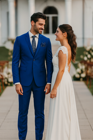 This striking royal blue suit is designed for men who want to make a bold and confident impression. Tailored with precision, the suit features a slim-fit silhouette that enhances posture and provides a sharp, modern look. The jacket includes a two-button closure, structured shoulders, and flap pockets, while the matching trousers offer a comfortable yet stylish fit. The vibrant blue color adds personality and charm, making it ideal for both formal and semi-formal occasions. Paired with a patterned tie and coordinating pocket square, this ensemble delivers a sophisticated, attention-grabbing appearance. Crafted from high-quality fabric, the suit ensures breathability, durability, and all-day comfort. Whether worn to weddings, parties, business events, or special celebrations, this suit helps you stand out with elegance and confidence. Perfect for anyone looking to upgrade their wardrobe with a unique, stylish, and memorable outfit.