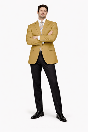 - I wore this blazer to a wedding and it stood out beautifully. The gold shade is vibrant yet classy. The two-button design looks sharp and professional. A fantastic addition to my wardrobe. - Julian Prescott