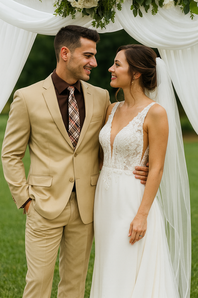 This elegant beige suit is crafted for men who appreciate timeless style with a modern touch. Made from a smooth, lightweight fabric, the suit offers exceptional comfort and a refined appearance suitable for all-day wear. The jacket features a two-button closure, clean lapel design, and tailored seams that create a sharp, structured silhouette. Paired with matching trousers, this ensemble delivers effortless sophistication. The warm beige tone adds versatility, making it ideal for both formal and semi-formal occasions. Styled with a dark brown shirt and patterned tie, the contrast enhances the suit’s charm and gives it a unique, polished look. Whether you're attending business meetings, weddings, outdoor events, or casual celebrations, this suit ensures you appear confident, stylish, and well-dressed. With durability and comfort combined, it’s a timeless addition to any gentleman’s wardrobe.