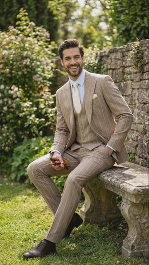 Upgrade your formal wardrobe with this Men's Beige Pinstripe Three-Piece Suit, designed for a polished, modern, and distinguished appearance. Crafted with a refined beige fabric featuring subtle white pinstripes, this suit offers a timeless yet contemporary look suitable for weddings, business meetings, evening events, and formal occasions.