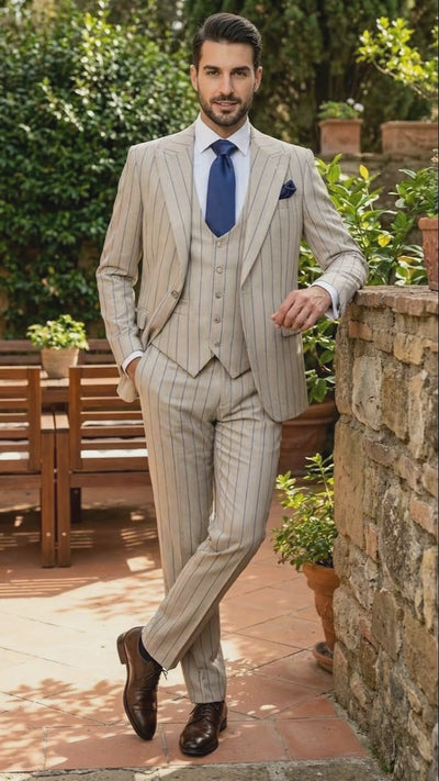 Elevate your formal wardrobe with this premium Men's Beige Pinstripe Three-Piece Suit, designed for style, comfort, and a modern tailored fit. Crafted from high-quality fabric, this suit features a refined beige base with sharp blue pinstripes, creating a timeless and sophisticated look suitable for weddings, business events, and special occasions.