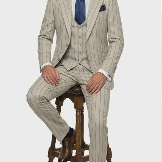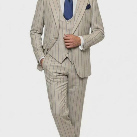 Men's Beige with blue Pinstripe Three-Piece Suit with Vest by Rossiman Vested Peak Lapel in Tan Stripe 1920s style