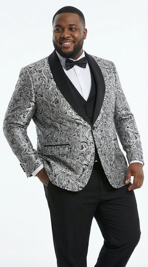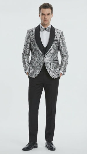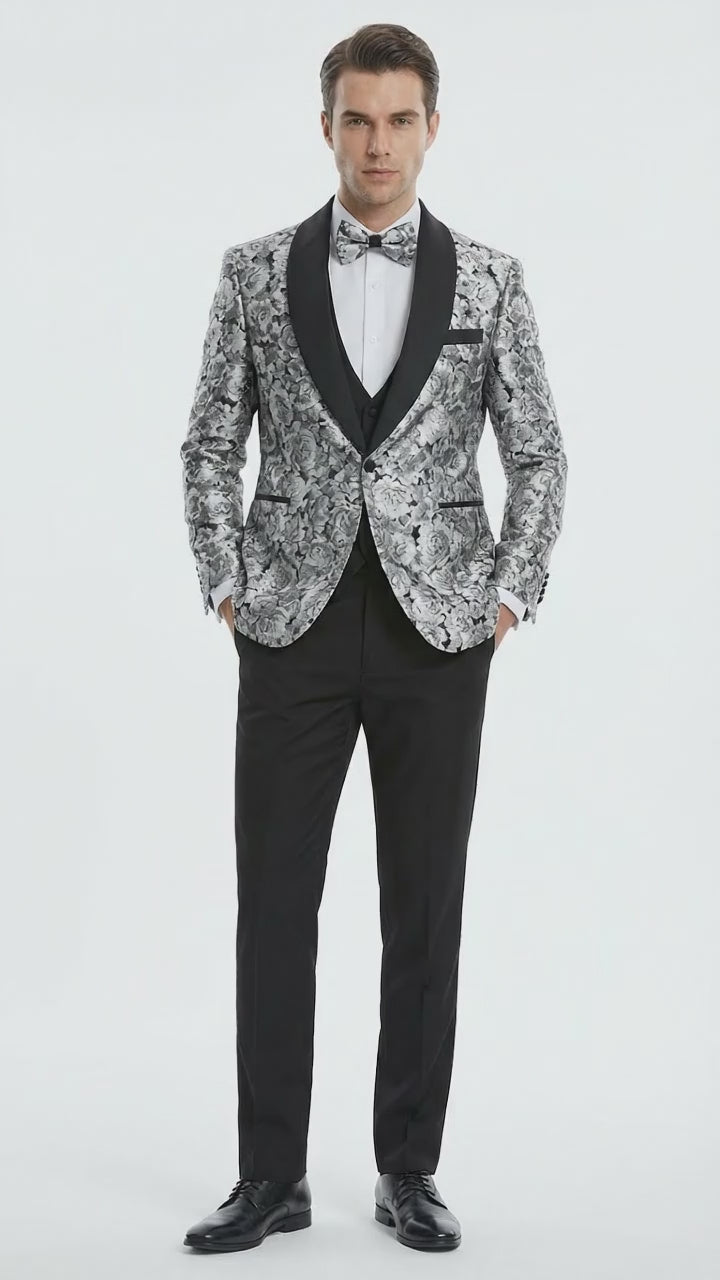 This formal tuxedo set includes a patterned silver and black tuxedo jacket with elegant black shawl lapel, a coordinating vest, and black tuxedo trousers that deliver a refined and polished silhouette. The unique floral design adds a stylish modern twist while maintaining a classic black tie appearance.