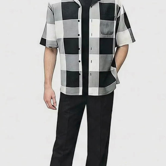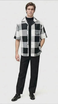 Make a bold style statement with this men’s black and white checkered short sleeve shirt set, designed for comfort and modern appeal. Featuring a classic button-up shirt with a relaxed fit and matching solid pants, this outfit is perfect for casual outings, weekend gatherings, vacations, and everyday wear.