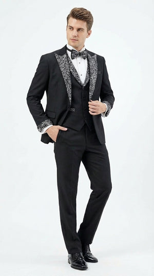Black tuxedo suit featuring a stylish white patterned lapel design, crafted for formal elegance and modern evening wear, ideal for weddings, prom nights, gala events, and special occasions.