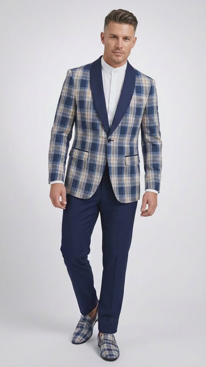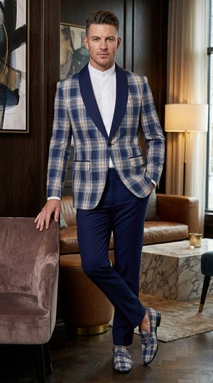 Crafted from high quality fabric, this mens blue and white tuxedo suit offers comfort, durability, and a polished finish. The plaid patterned jacket with contrasting navy lapel enhances the overall elegance, while the matching navy pants and coordinated details complete the look.