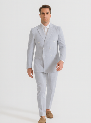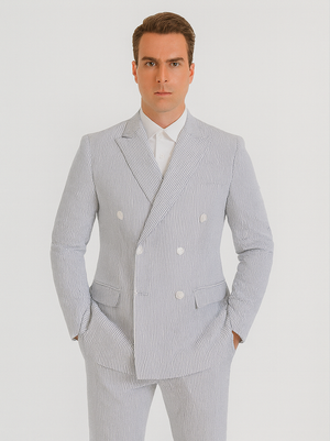 The Blue Pinstripe Seersucker Double Breasted Suit is a refined warm-weather essential that combines classic tailoring with breezy comfort. Crafted from lightweight seersucker fabric, it delivers natural breathability, wrinkle resistance, and a crisp texture—ideal for spring and summer.