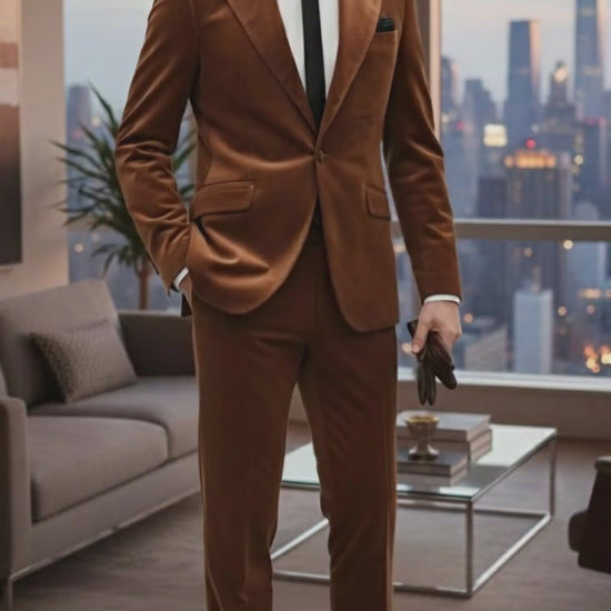 Make an unforgettable impression with this Mens Brown Velvet 2-Piece Suit, tailored for men who appreciate luxurious texture, modern silhouettes, and standout formal style. Crafted from premium velvet in a rich rust-copper brown tone, this suit brings together elegance, comfort, and contemporary fashion—perfect for weddings, parties, festive events, galas, prom nights, and upscale evenings.