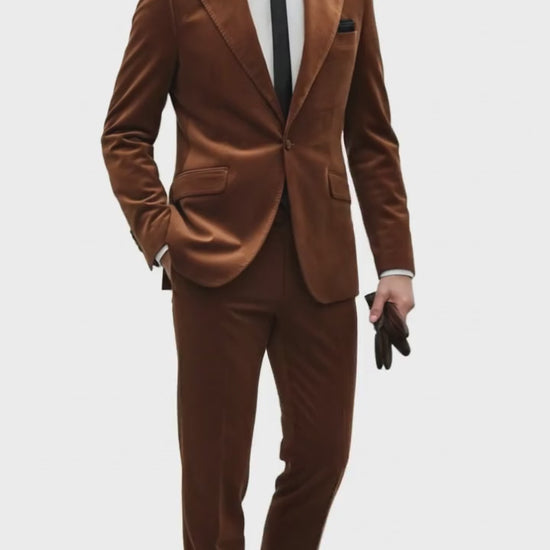 Mens Brown Velvet 2-Piece Suit – Luxury Slim Fit Formal Blazer and Pants Set in Rust Copper Color