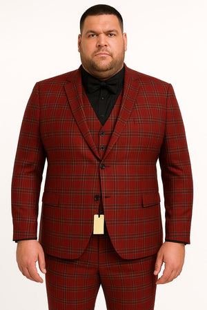 Mens Burgundy Plaid Three-Piece Suit – Ultra Slim Fit Checkered Windowpane Redish 544-10