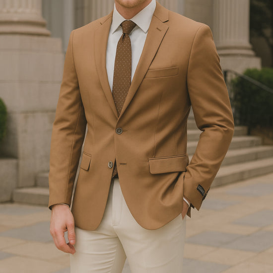 - Elegant camel brown sport coat with a modern, versatile look