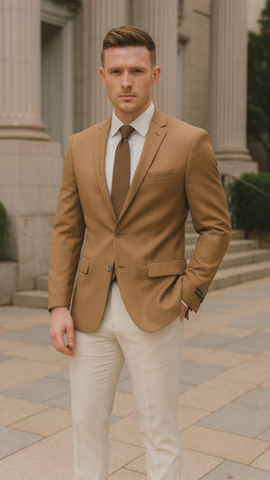 Upgrade your style with this men’s camel brown two-button sport coat, crafted for the gentleman who appreciates both versatility and elegance. Featuring a refined notch lapel, classic two-button closure, and a sleek tailored fit, this blazer delivers timeless sophistication with a modern edge.