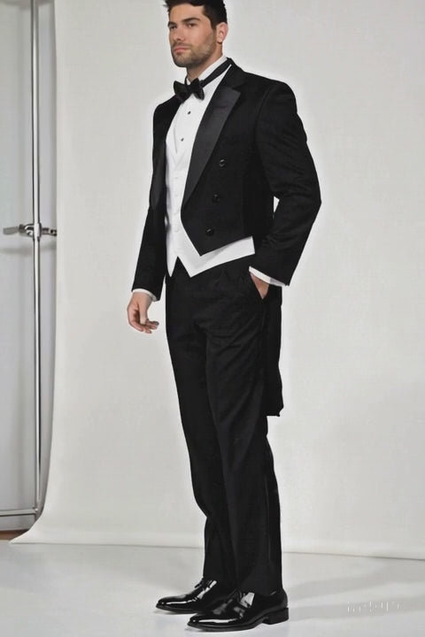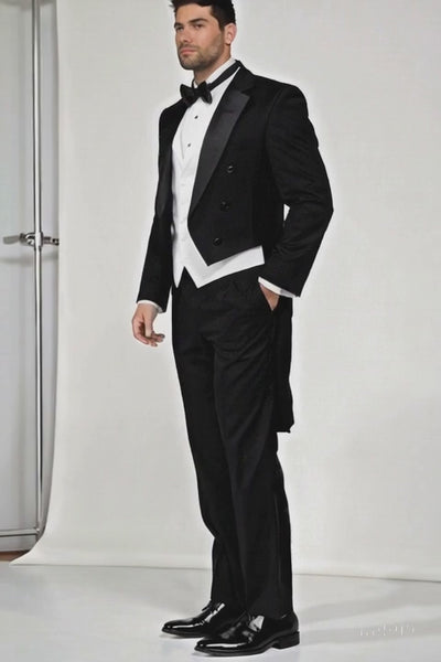 Jacket Style: Black tailcoat with a long back, peak lapels, and a fitted front