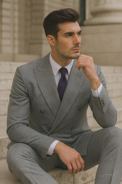 Step into timeless sophistication with this Glen Plaid Double-Breasted Suit in grey. Crafted from premium wool-feel fabric, this suit blends comfort with structure, giving you a refined, heritage-inspired look. The classic Glen Plaid pattern adds subtle texture and depth, making it stand out from plain suits while staying polished and versatile. The double-breasted jacket with peak lapels enhances the masculine silhouette, while the tailored trousers complete the distinguished ensemble.