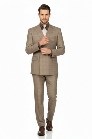 Mens Classic Wool Feel Double Breasted Glen Plaid Suit in Tan