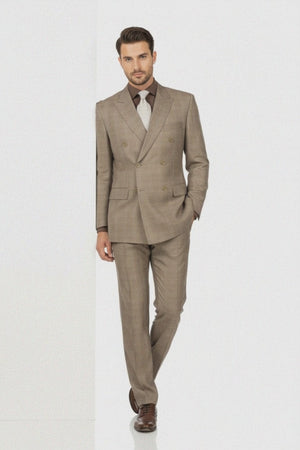 This sophisticated suit is crafted from a high-quality wool-feel Glen Plaid material in a distinguished tan color. It offers a timeless and traditional style with its classic fit, ensuring comfort and a well-defined silhouette. The jacket is a striking 6-on-2 double-breasted design, featuring six buttons in total with two functional closure points. A key characteristic is the elegant wide peak lapel, which enhances the shoulders and draws the eye upward. For ease of movement and a refined drape, the jacket is finished with practical side vents. Completing the ensemble, the matching suit trousers are tailored with a classic single pleat.