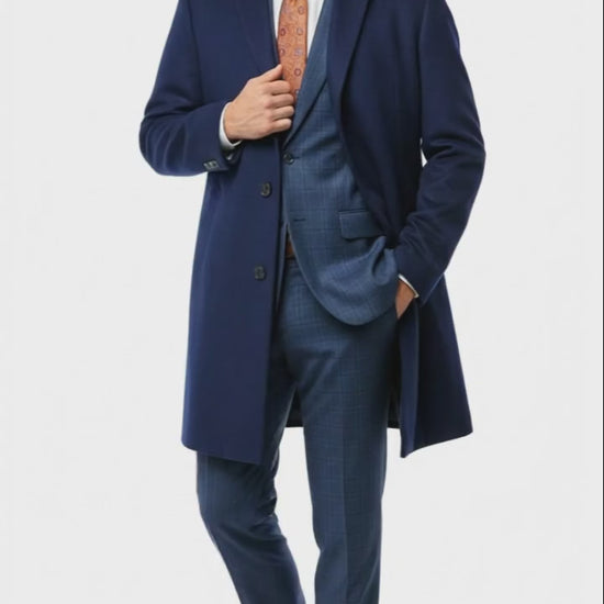 This navy wool and cashmere topcoat blends classic tailoring with modern appeal, making it a wardrobe essential for men who value both style and quality. It’s the ideal choice for staying warm while maintaining a sharp, professional appearance through the colder months.