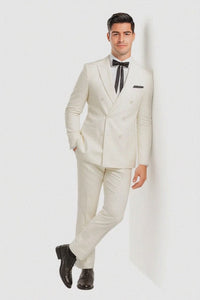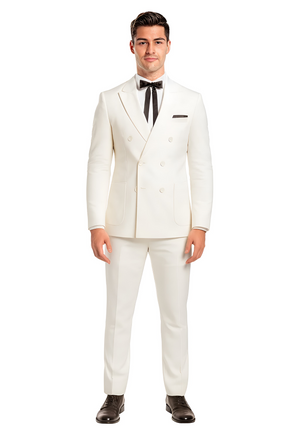 Crafted with attention to authenticity, the costume features a crisply tailored double-breasted jacket in a brilliant white finish that instantly evokes the legendary look of the Colonel himself. The jacket showcases wide peak lapels, signature white tone-on-tone buttons, and perfectly shaped rounded patch pockets, giving the suit an elevated vintage appeal. A sleek black pocket square completes the upper detail, offering contrast that is both elegant and instantly identifiable.