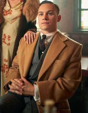 Mens Costume Michael Gray Vested Grey Pinstripe Suit & Camel Overcoat