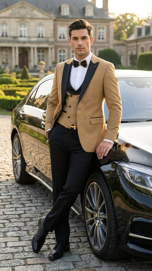 Men's Dark Camel Tan Khaki and Black Great Gatsby Tuxedo Suit – Vintage 1920s Formal Wedding, Party and Event Wear