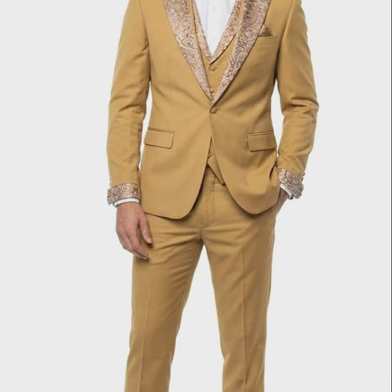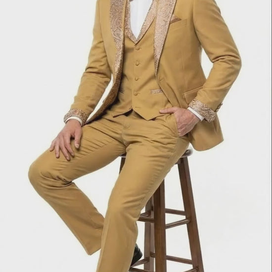 The tuxedo jacket features an ornate patterned shawl lapel and matching cuff accents, adding elegance and distinctive detail to the suit's overall design. The coordinating vest enhances the formal layered style, while the tailored pants complete the outfit with a clean and polished silhouette. Made from high-quality fabric, this suit provides comfort, durability, and a premium finish suitable for all-day wear.