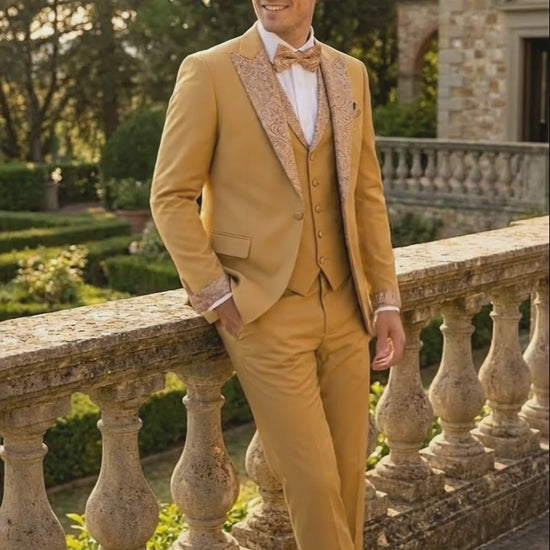 Men's Gold Embellished Tuxedo Suit + Bowtie – Slim Fit Jacket, Vest and Tailored Pants