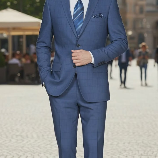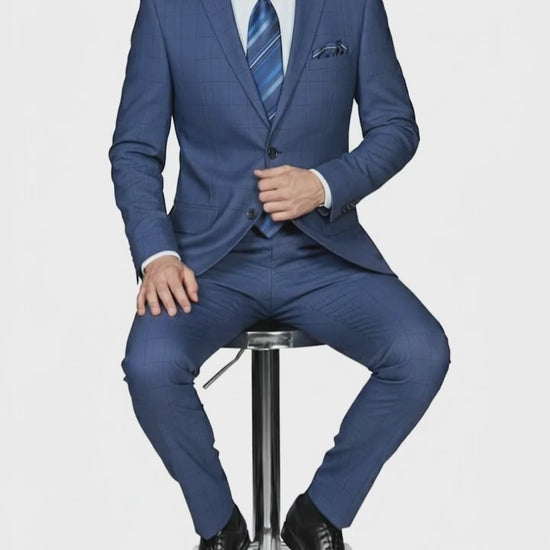 Mens Indigo Navy Blue Windowpane Check Suit – Classic 2-Piece Formal Business and Wedding Wear Set in Cobalt Blue