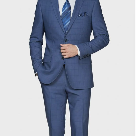 Pair this navy windowpane suit with a crisp white shirt and a striped blue tie for a powerful business look, or go tie-free with a pocket square for an effortlessly stylish evening outfit.