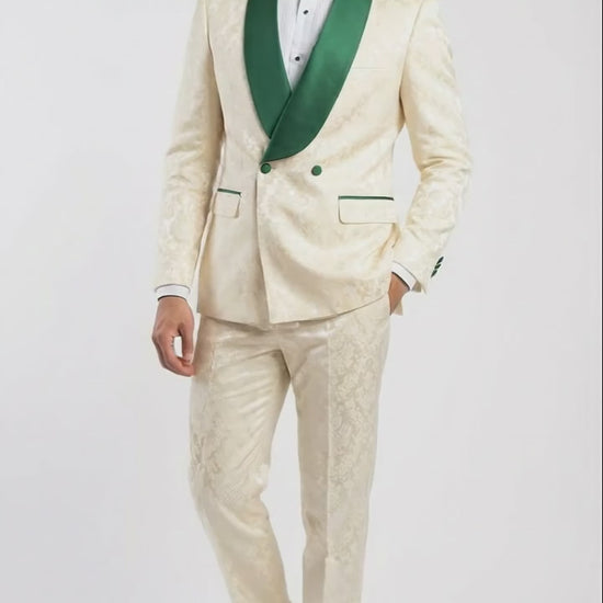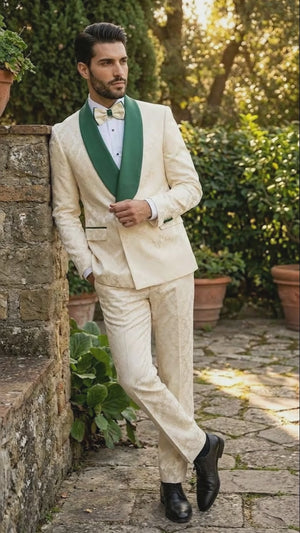 Showcase a bold and sophisticated style with this men's ivory and emerald green jacquard tuxedo suit, expertly designed for high-profile formal events. Made from premium jacquard fabric, the suit features an elegant textured pattern that enhances its luxurious appearance. The smooth ivory base paired with a rich emerald green satin shawl lapel creates a striking and refined color contrast, perfect for weddings, proms, galas, and black-tie celebrations.