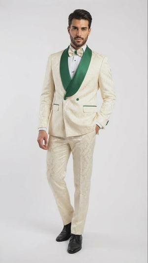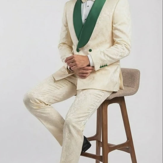 Men's Ivory and Emerald Green Jacquard Tuxedo Suit + Bowtie – 3-Piece Formal Wedding, Prom, and Gala Outfit