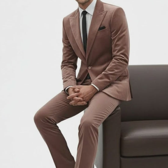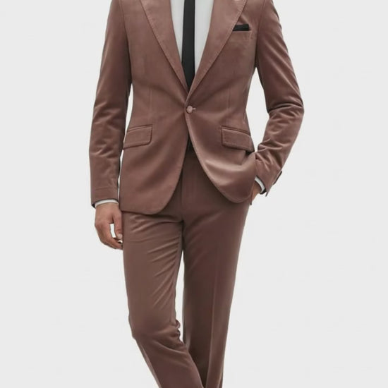 Mens Mauve Velvet Suit – 2 Piece Ultra Slim Fit Blazer and Pants Formal Set in Light Brown Tuxedo