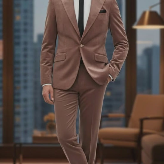 The blazer features a single-breasted design with peak lapels, a one-button closure, flap pockets, and a classic chest pocket for a polished finish. Crafted from premium velvet, the unique mauve color makes this suit a striking alternative to traditional black or navy, perfect for men who appreciate bold fashion choices.