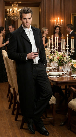 The deep black color enhances the sophisticated and powerful aesthetic, making it perfect for formal occasions, vintage themed events, stage performances, and special celebrations. The extended long coat design, classic lapel collar, and structured tailoring create a sharp and refined silhouette that stands out in any setting.