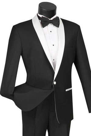 This modern fit contrast shawl lapel tuxedo comes in a soft wool feel material with flat front pants.