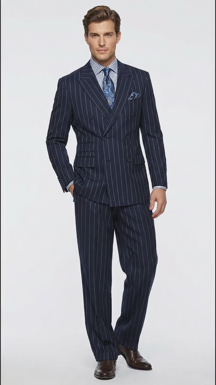 Step into timeless sophistication with this men's navy blue double breasted pinstripe suit, designed for a refined and authoritative look. Tailored in a classic fit, this navy pinstripe formal suit for men features a traditional double breasted jacket paired with , offering comfort, elegance, and vintage-inspired style.