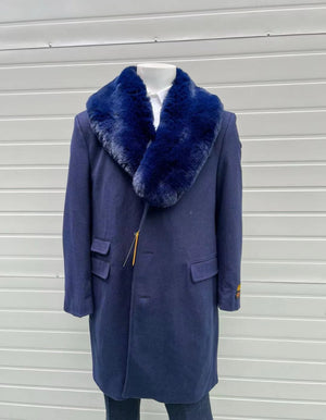 Mens Navy Wool Overcoat with Royal Blue Faux Fur Shawl Collar Cashmere Carcoat