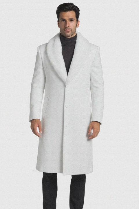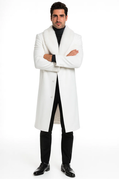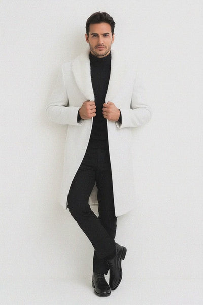 Mens Overcoat with Fur Collar - Single Breasted Off White Topcoat