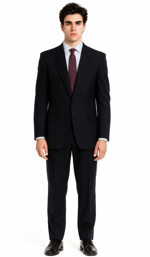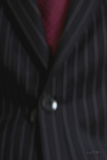 The jacket boasts a fully lined interior for maximum comfort, along with classic notched lapels, a sharp two-button closure, and multiple pockets for practicality and style. Its tailored fit ensures a clean drape while maintaining flexibility so you can move with ease throughout any event. The shoulders are structured to give you a strong, sculpted look—instantly elevating your presence. Paired with matching pinstripe trousers, this ensemble creates a seamless, well-coordinated outfit that speaks volumes without saying a word.