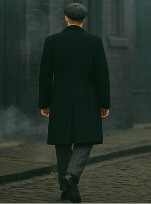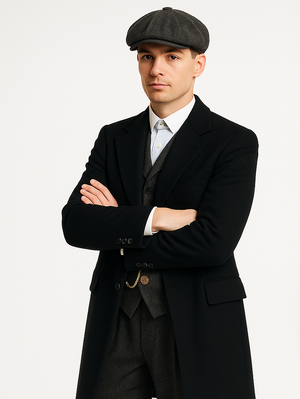 Step into the gritty elegance of 1920s Birmingham with this Thomas Shelby-inspired outfit, featuring a sharp grey 3-piece suit, a commanding black wool overcoat, and the signature newsboy flat cap. Designed to mirror the style of the infamous Shelby leader from Peaky Blinders, this ensemble perfectly blends vintage sophistication with a rugged edge.