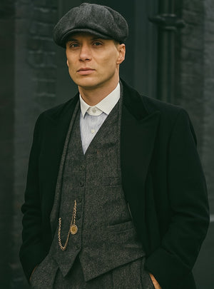 The grey suit exudes understated charm, crafted with classic tailoring for a clean silhouette. The double or single-breasted vest and matching trousers create a polished, old-world look, while the black overcoat adds a layer of drama and authority. Completing the outfit is the traditional flat cap, instantly recognizable as Thomas Shelby’s signature accessory.
