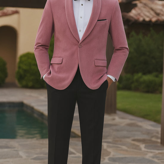 Mens Pink Velvet Tuxedo Dinner Jacket with Shawl Lapel – Slim Fit Blazer for Weddings, Prom in Rose Gold Color