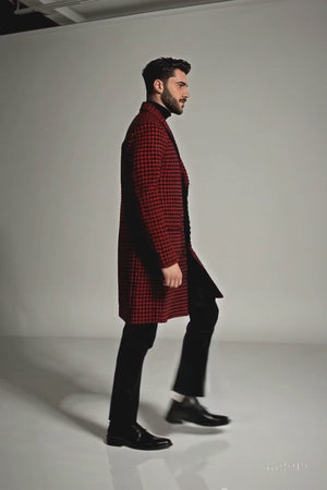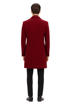 This overcoat features a rich red and black houndstooth checker pattern, blending heritage menswear aesthetics with a vibrant, fashion-forward color palette. The smooth gradient effect from darker tones at the top to deeper saturation toward the bottom creates a visually captivating look that stands out from traditional outerwear options. Whether worn over a suit or layered with a turtleneck and slacks, this coat delivers sophisticated flair from every angle.