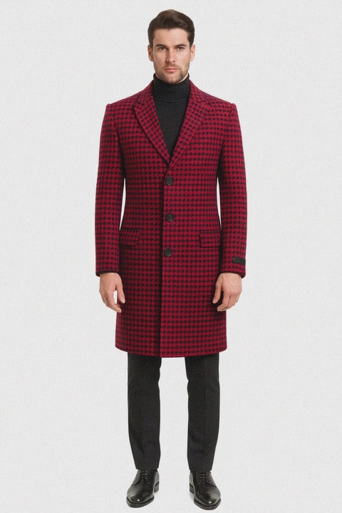 Mens Plaid Overcoat - Houndstooth Single Breasted Checker Pattern Red Topcoat