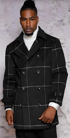 Mens Plaid Overcoat - Wool Peacoat - Black Plaid Topcoat