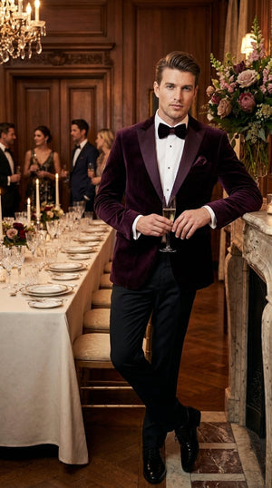 Plum eggplant velvet mens blazer jacket designed for luxury style and standout formal elegance. This plum velvet dinner jacket features a rich eggplant color and smooth velvet texture that adds depth and sophistication, making it an excellent choice for weddings, tuxedo events, formal parties, gala nights, and evening occasions.