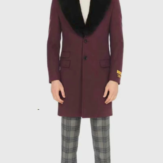 Mens Purple Wool Overcoat with Black Faux Fur Collar – Luxury Winter Dress Coat for Formal and Casual Wear