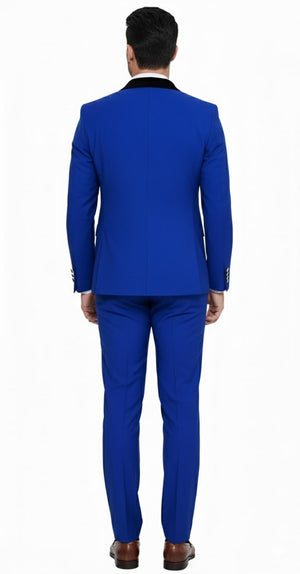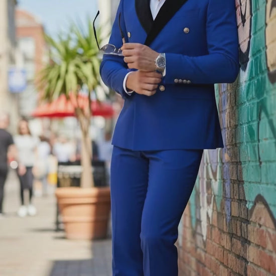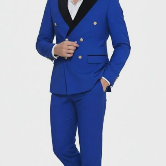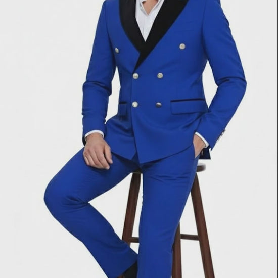Mens Royal Blue Double-Breasted Tuxedo Suit – Modern Slim Fit Formal Wedding and Prom Outfit with Black Satin Lapel