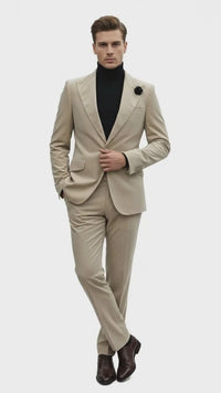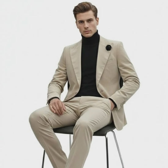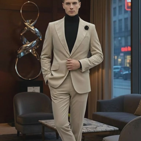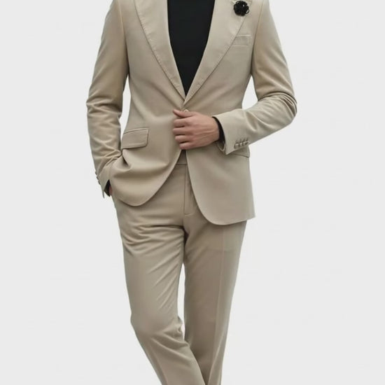 Mens Sand Beige Velvet Tuxedo Suit – 2 Piece Slim Fit Blazer and Pants Formal Set - Winter Fabric Natural Color