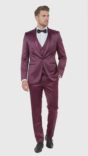 Mens Sateen Shiny Burgundy Slim Fit Tuxedo – Satin Shawl Lapel 3-Piece Suit