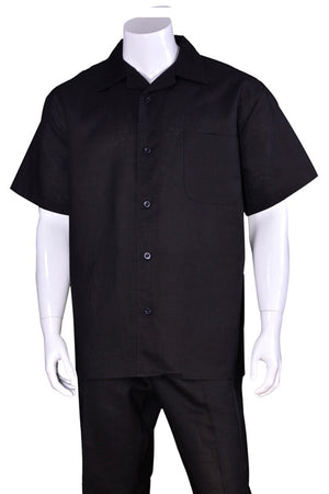 Mens Short Sleeve 100% Linen Casual Leisure Set Walking Suit in Black